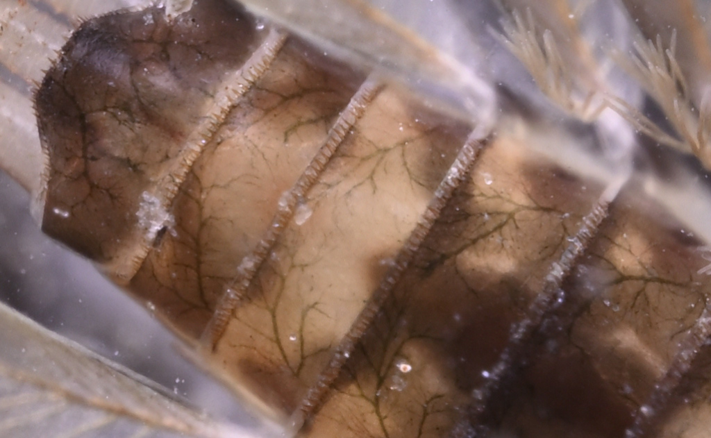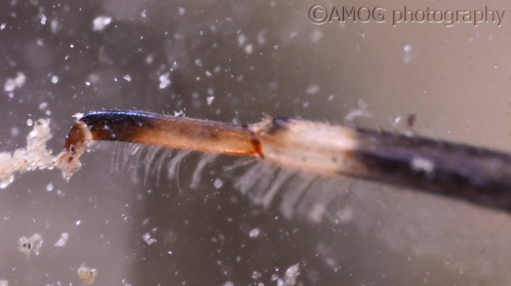 Upper margin of hind femora with distinct row(s) of pointed bristels ventrally, behind the fringe of hairs.