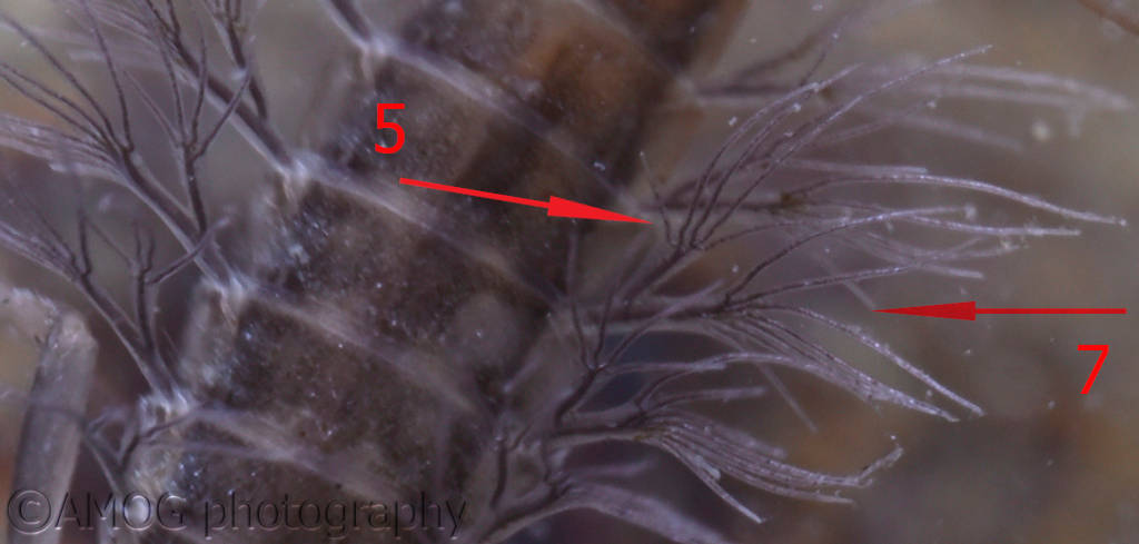 Main stem of the gill tuft with less than twice as many filaments as the secondary stem.