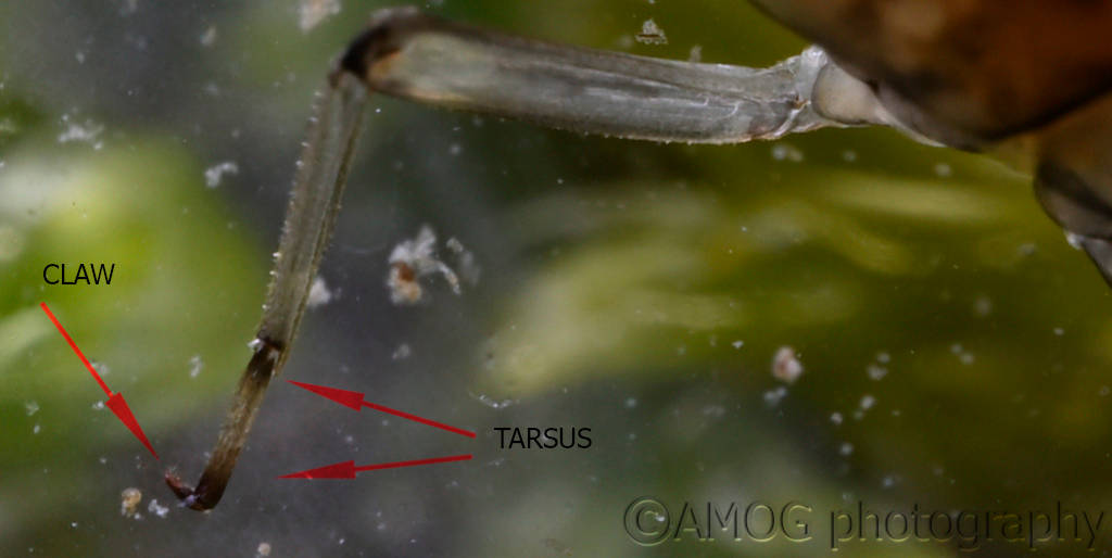 Legs: grayish, with base and apex of tarsi darker. Claw dark brown. Femora with one or two longitudinal dark stripes.