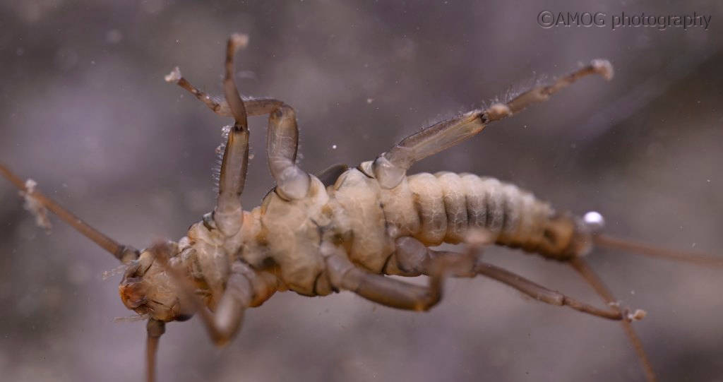 I found 3 specimens all under a rock in a strong current. In the pictures: the dark larva with bent epiprocts is a male.
